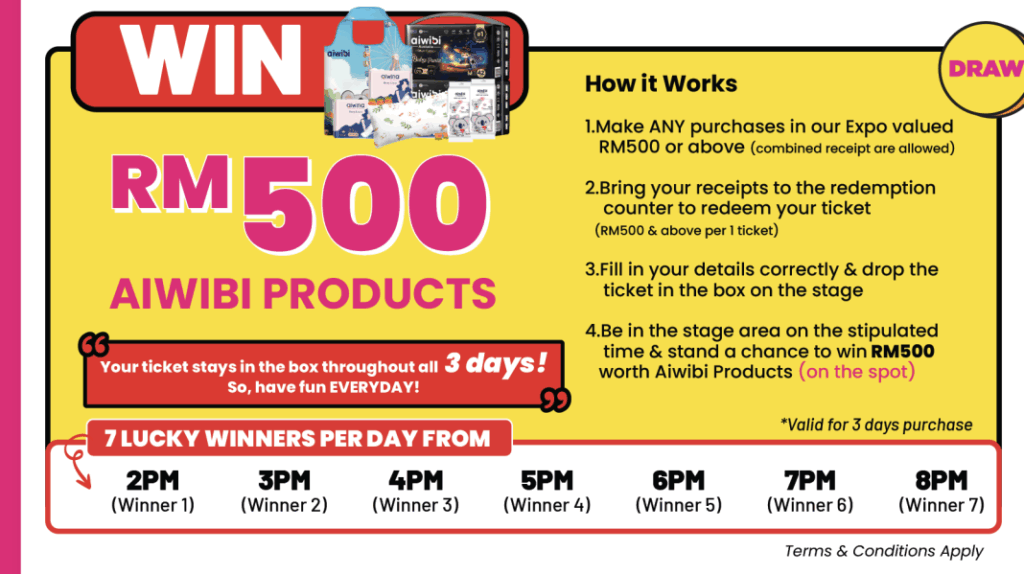 • Hourly Lucky Draws: Stand a chance to win RM500 AIWIBI Products hourly lucky draws with a minimum spend of RM500.