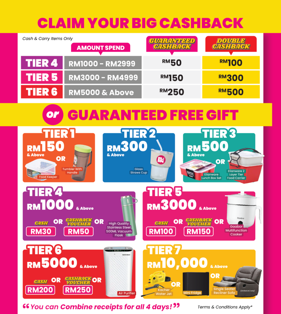 2.1. Guaranteed cashback – Applicable for cash & carry items only, cap at RM20,000 Cash or Cash Voucher per day, DAY 1 unlimited CAP.